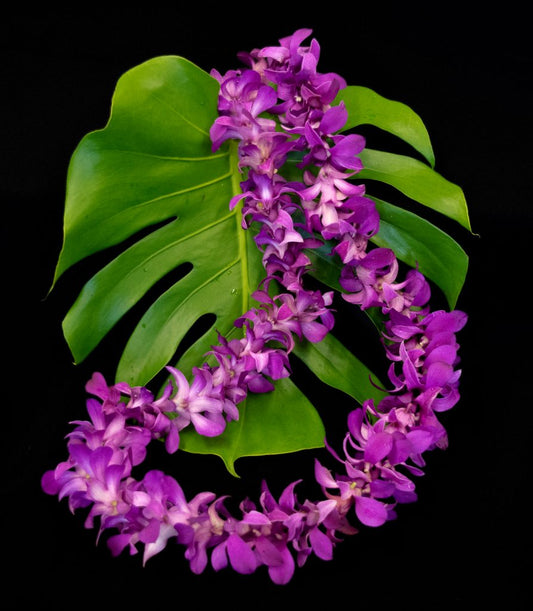 Purple & White Dendrobium Lei with Ti-leaf accents